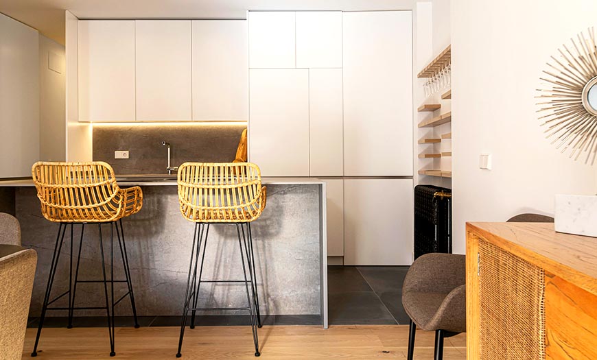 2. Reforma de cocina con enfoque funcional, encimeras técnicas, mobiliario de alta durabilidad y electrodomésticos de bajo consumo.
